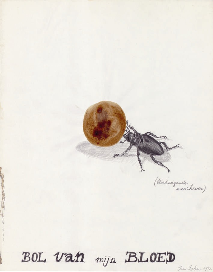 Jan Fabre, Ball Of My Blood -Bloodsucking Beetle, 1982, matita HB e sangue su carta; disegno dalla serie My Bloedprop,my Bloodprints, 1978-1982, collezione privata. |