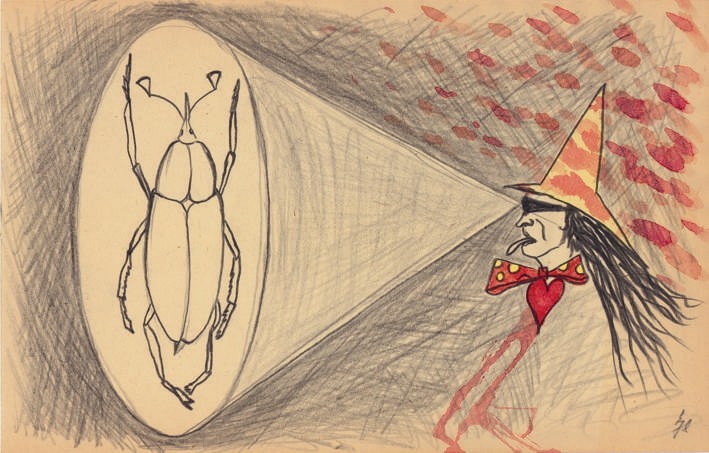 Jan Fabre, Magician’s Eyes of the Pill Roller, tecnica mista su carta, disegno dalla serie The Holly Pill Roller, 1978-1979, collezione MUHKA, Antwerp. |